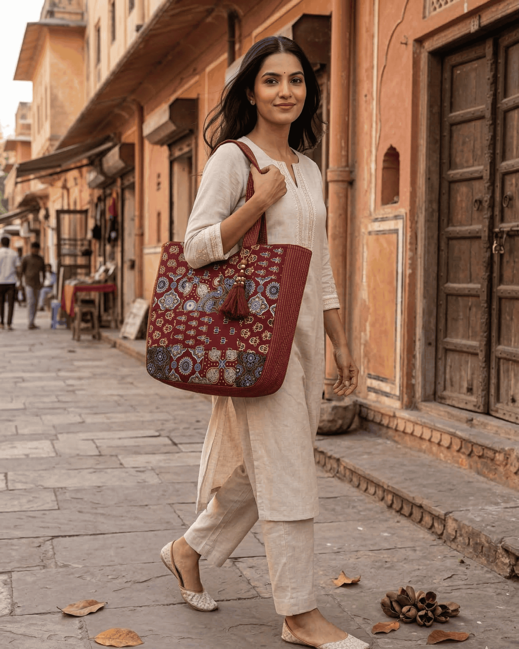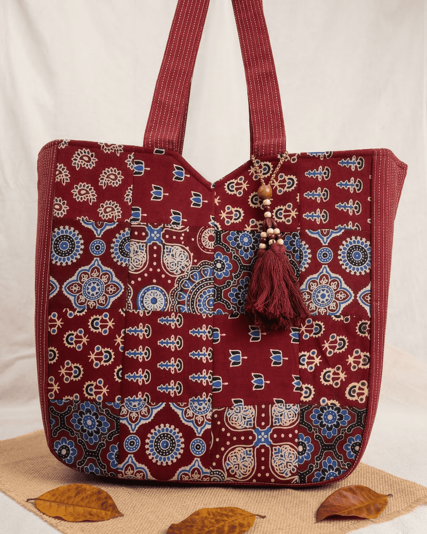 Maroon ajrakh block-printed cotton tote with patchwork detailing. Features a secure main zipper and interior zippered pocket for organized daily carry. Quality construction and spacious design perfect for everyday use.